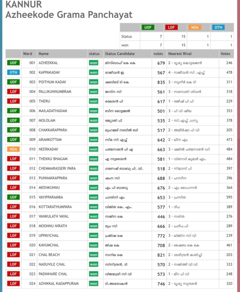 അഴീക്കോട് ഗ്രാമപഞ്ചായത്ത് ഭരണം എൽഡിഎഫിന്; ; യുഡിഎഫ് 7 സീറ്റുകളിൽ വിജയിച്ചു